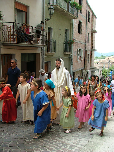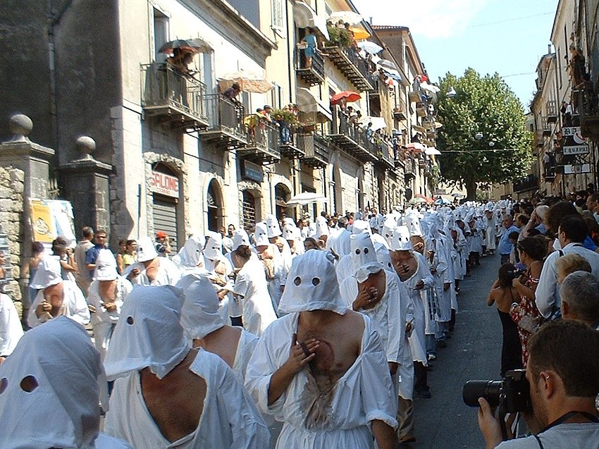 Fa caldo, è domenica, una giornata di straordinaria bellezza, per le vie di Guardia Sanframondi è tutto un mormorio, basso, sommesso, un movimento di gente smaniosa entra ed esce dai bar, sosta nelle piazze, nei pressi delle fontane, va su e giù desiderosa di assistere alla settennale ricorrenza. Una terra immobile, come pietrificata nel tempo, si scuote, si mette in movimento, apre una breccia nel proprio isolamento. Semplicemente cerca vita in un paesaggio di rovine. Un luogo nondimeno eletto. Un luogo con un suo senso, un suo sentimento. Un luogo tutto speciale. Un posto in cui tornare. Capannelli di giovani, donne, anziani e bambini sbucano da ogni vicolo; crocchi di gente curiosa si formano qua e là: le porte delle case, i balconi e le finestre si animano. La “Festa”, la processione, i misteri, i costumi, tutto è atteso con un misto di ansia e di speranza. Un legame con il sacro, e insieme, la comunione necessaria tra luogo e persone, l’essere cioè iscritti come presenze entro uno stesso circolo vitale, presenti e agenti nello stesso spazio del paese. Il sole è alto sull’orizzonte e le ombre sono le più corte. L’attenzione ora è concentrata su quelle figure mobili e statiche che animano la “Festa”. Donne, uomini, bambini in costume con lo sguardo fisso al cielo. Una “gara” che non è una semplice prova sulla scena più stupefacente ma è anche una penitenza, un’offerta di fatica e sudore. L’intensità dell’attesa, della preparazione, del superamento della soglia, dell’incontro, della sosta, del cammino, dello spaesamento. E poi, ad un tratto: Eccoli! Eccoli! I Battenti, grida una voce tra la folla accalcata. Ed in un baleno tutti accorrono allo “spettacolo”. Oddio, ma quanti sono! Rumoreggia la gente. Eccoli! Eccoli! I Battenti. Vestiti di bianco. Il volto nascosto. Un crocifisso, l’immagine dell’Assunta e un sughero irto di spille tra le mani, volte al petto. Eccoli! Eccoli! Incolonnati, con andatura compunta, percorrere le vie principali dell’abitato. Sull’acciottolato, sulle scalinate del paese antico, davanti agli usci delle case, lasciano sprizzare il sangue caldo e rosso dal petto, percosso e punto da un sughero aculeato. Eccoli! Eccoli! L’incontro liberatorio con la Madre, e poi, al tramonto, quando l’atto di penitenza è compiuto e l’effetto del buon vino scemato, il rientro a casa.