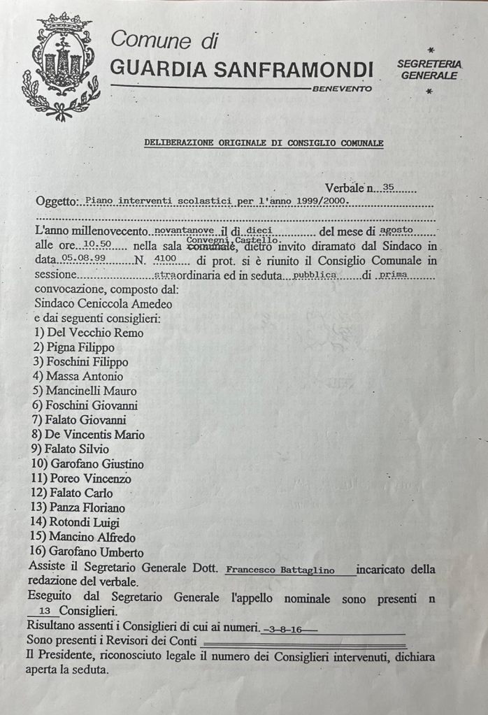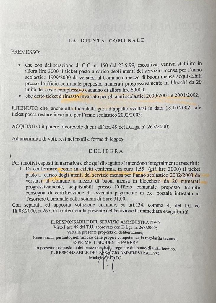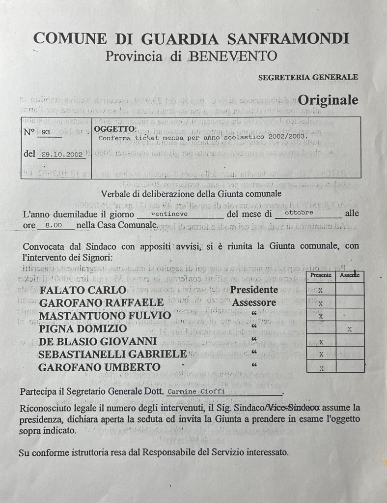 P.S. Per amore di verità, dobbiamo ricordare che la forma di gestione adottata ebbe risultati molto positivi in merito alla qualità del servizio, alla presenza degli alunni e all’assunzione, anche se temporanea, di 3 unità tutte locali addette alla cucina da parte della ditta Progea s.r.l. (che si era aggiudicata l’appalto) e i governanti subentrati al Sindaco Ceniccola non esitarono a continuare la forma di gestione privatizzata e confermare in euro 1,55 (già lire 3000) il ticket pasto a carico degli utenti del servizio mensa per l’anno 2002/2003 (vedi delibera G.C. N°93 del 29.10.2002) dopo aver accusato il Sindaco Ceniccola di voler attentare alla vita dei figli della comunità guardiese. Alla faccia della coerenza! Questa vicenda deve essere ricordata e raccontata per far capire il metodo che è stato usato per far fuori civilmente e politicamente il Sindaco Ceniccola e poter riconquistare il bastone del comando.